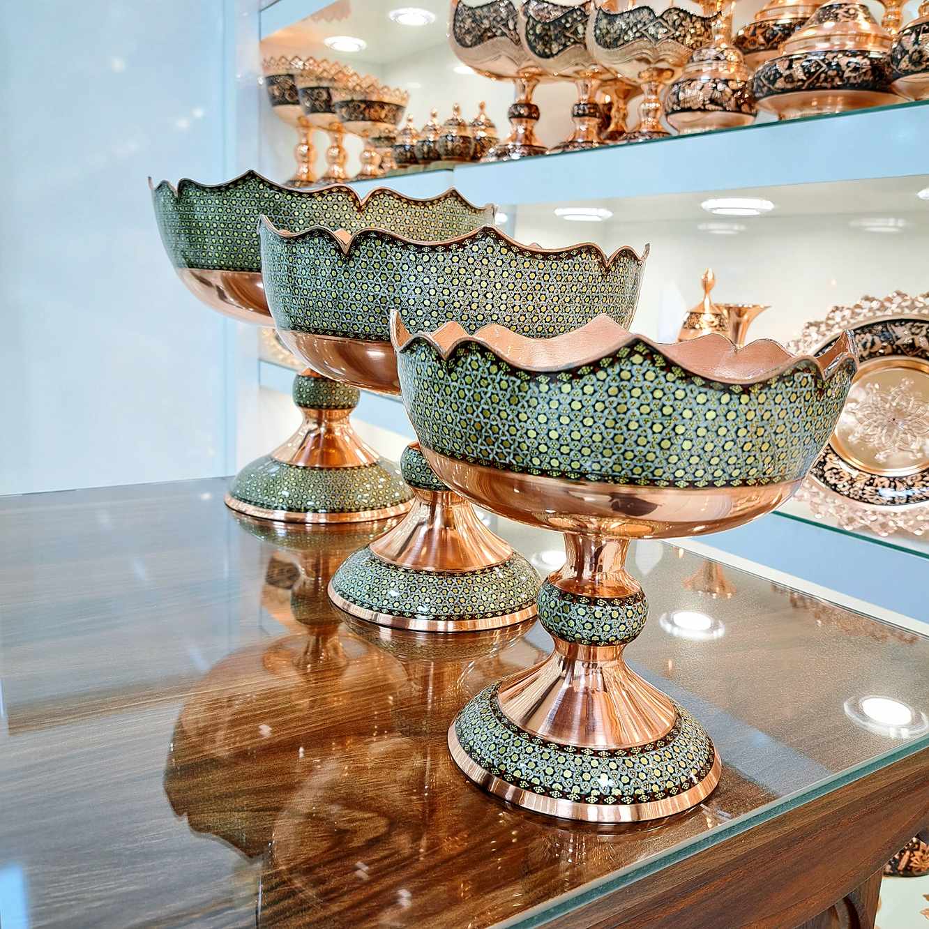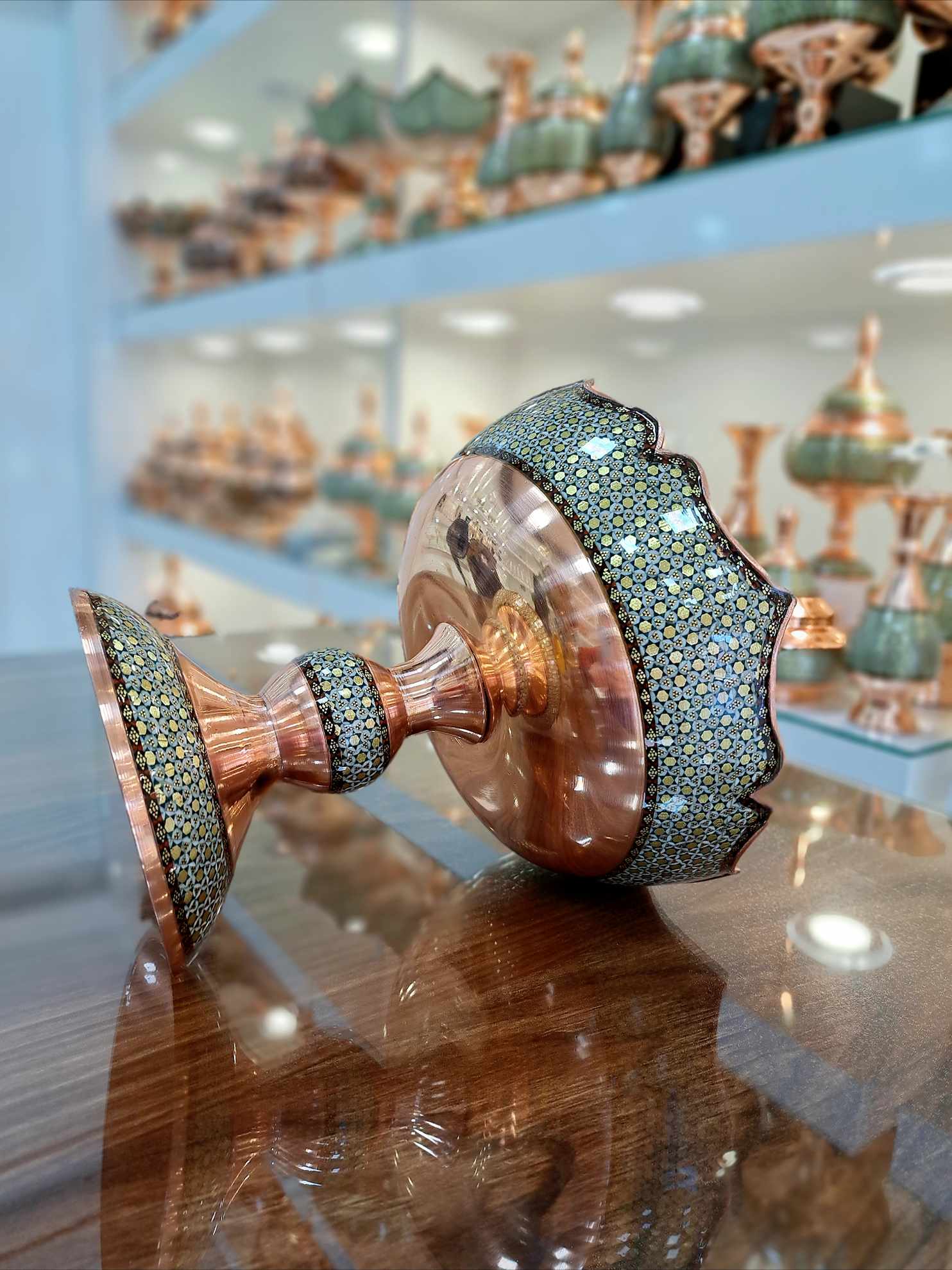 تولیدی صنایع دستی اشرافی با به کارگیری بهترین و ماهرترین استادکاران ظروف مس و خاتم را تولید میکند.