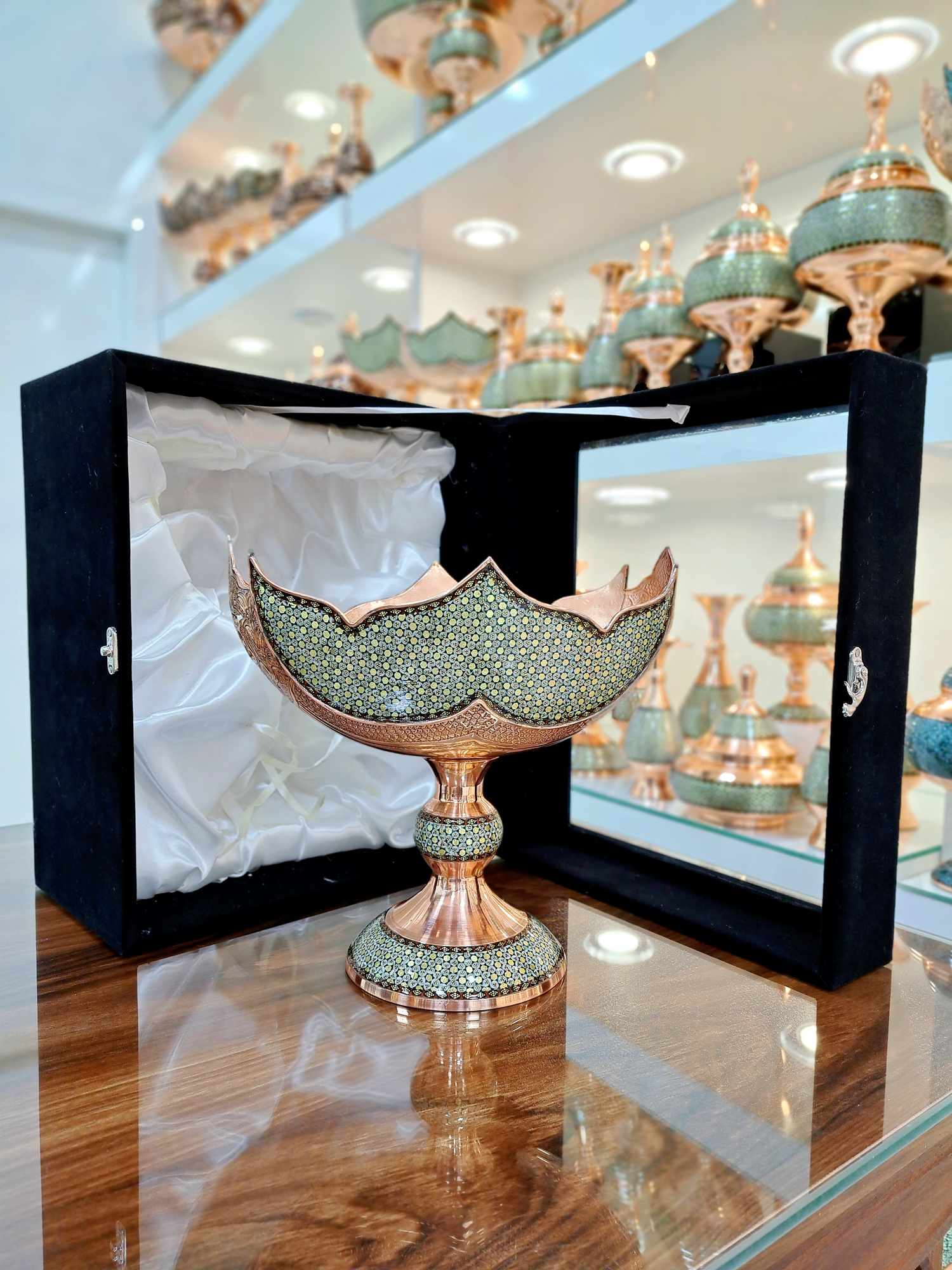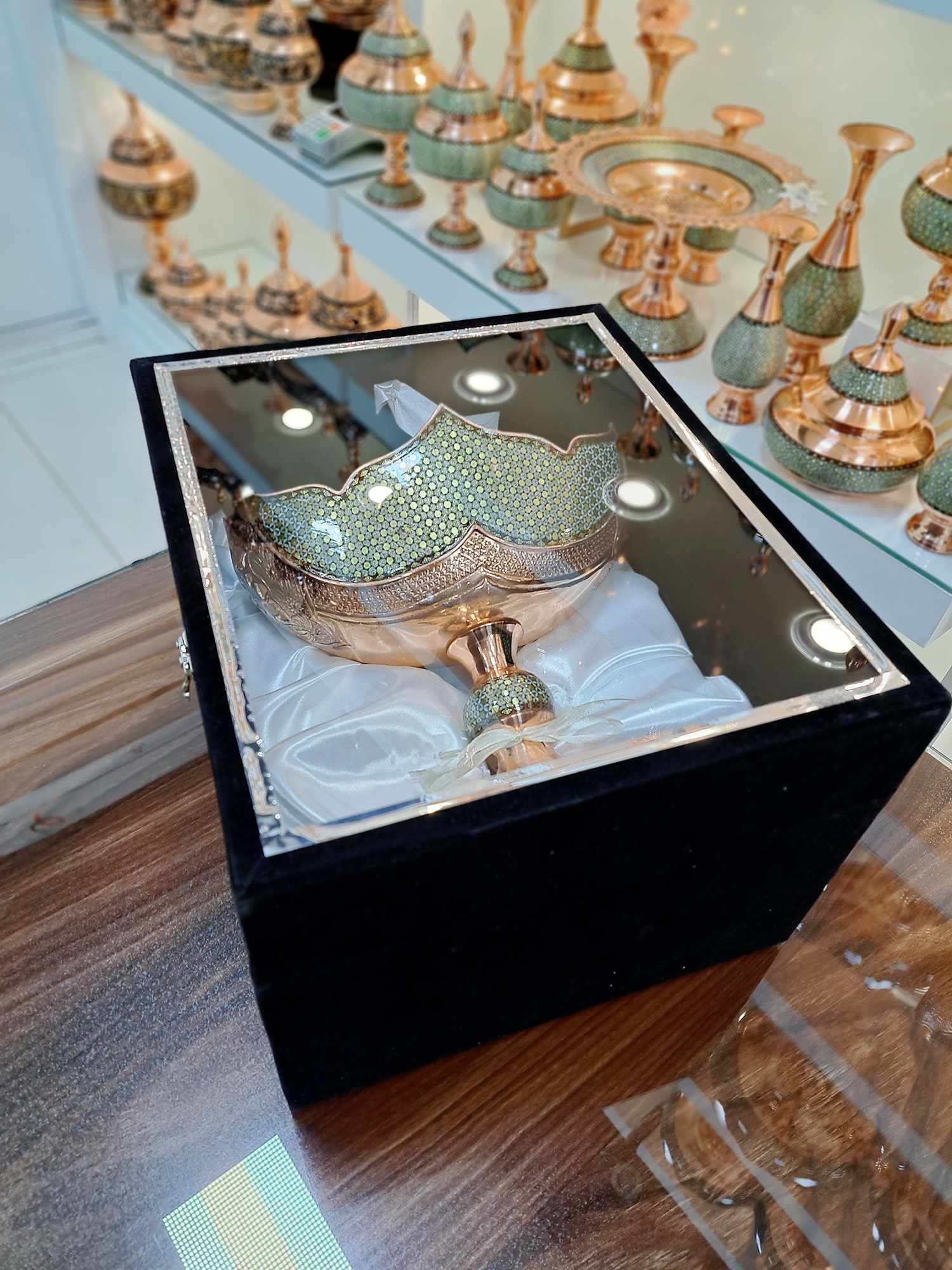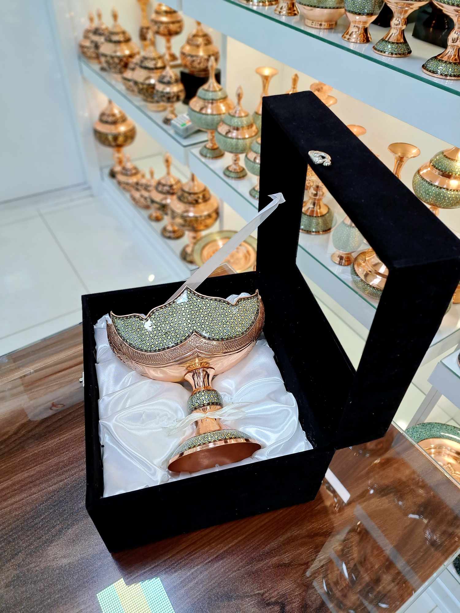تولیدی صنایع دستی اشرافی با به کارگیری بهترین و ماهرترین استادکاران ظروف مس و خاتم را تولید میکند.