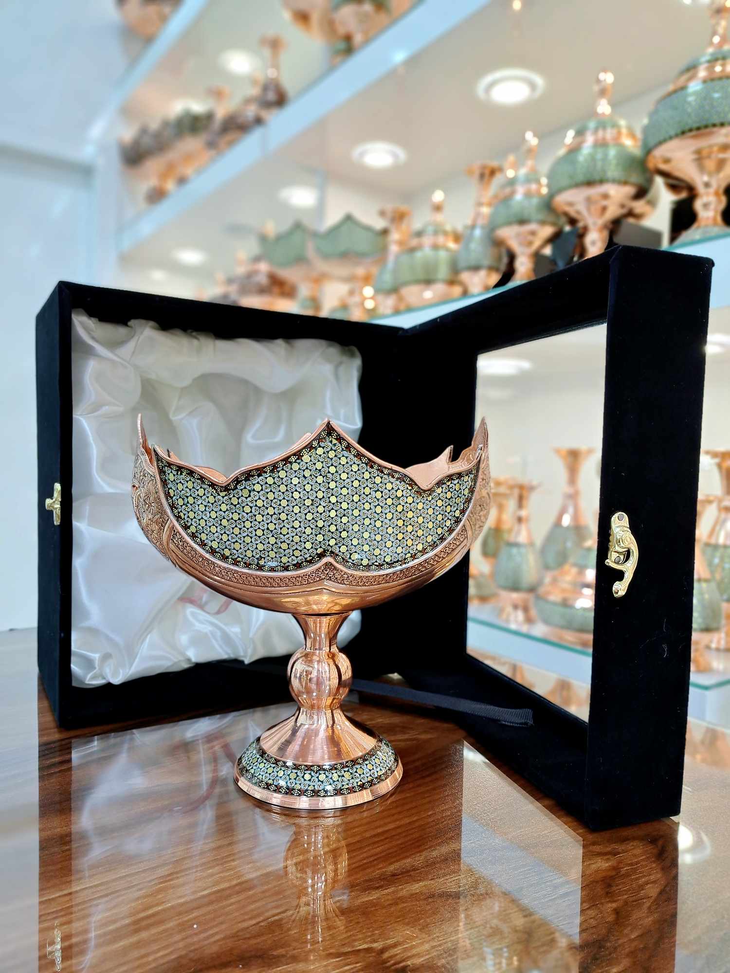تولیدی صنایع دستی اشرافی با به کارگیری بهترین و ماهرترین استادکاران ظروف مس و خاتم را تولید میکند.