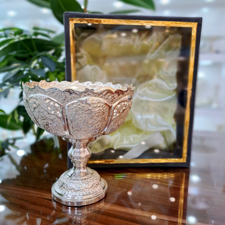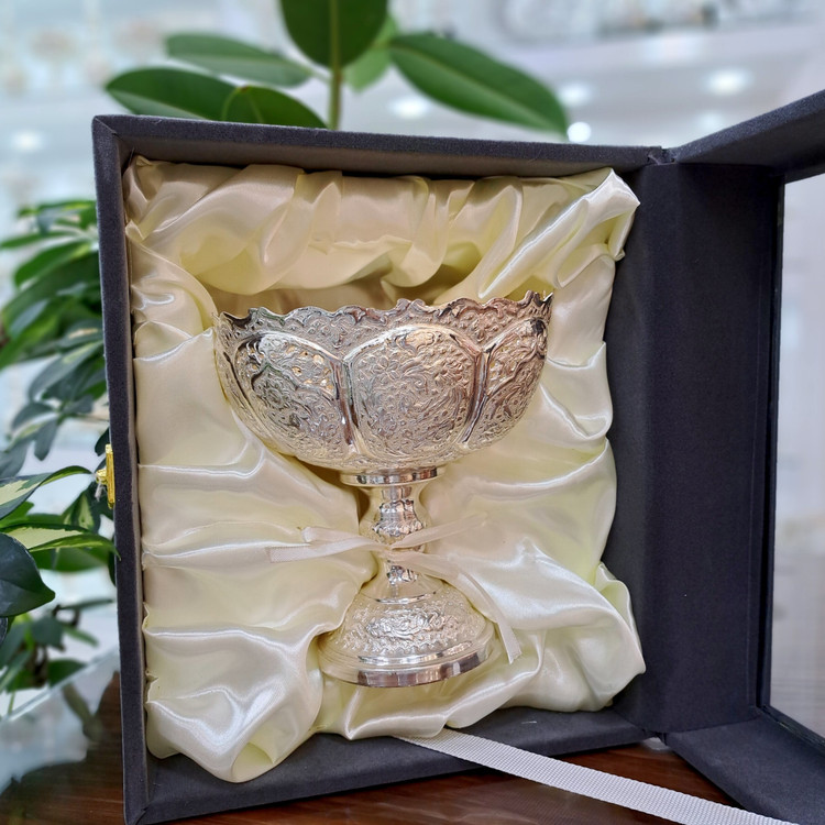 کاسه آجیل قلمزنی نقره نما با روکش نقره به همراه باکس جیر