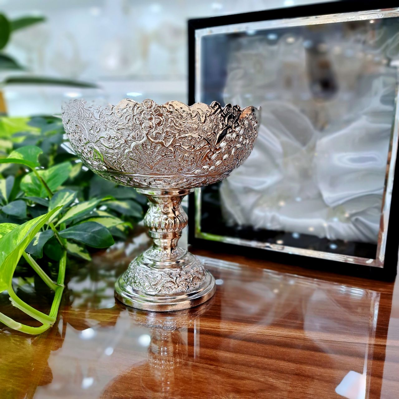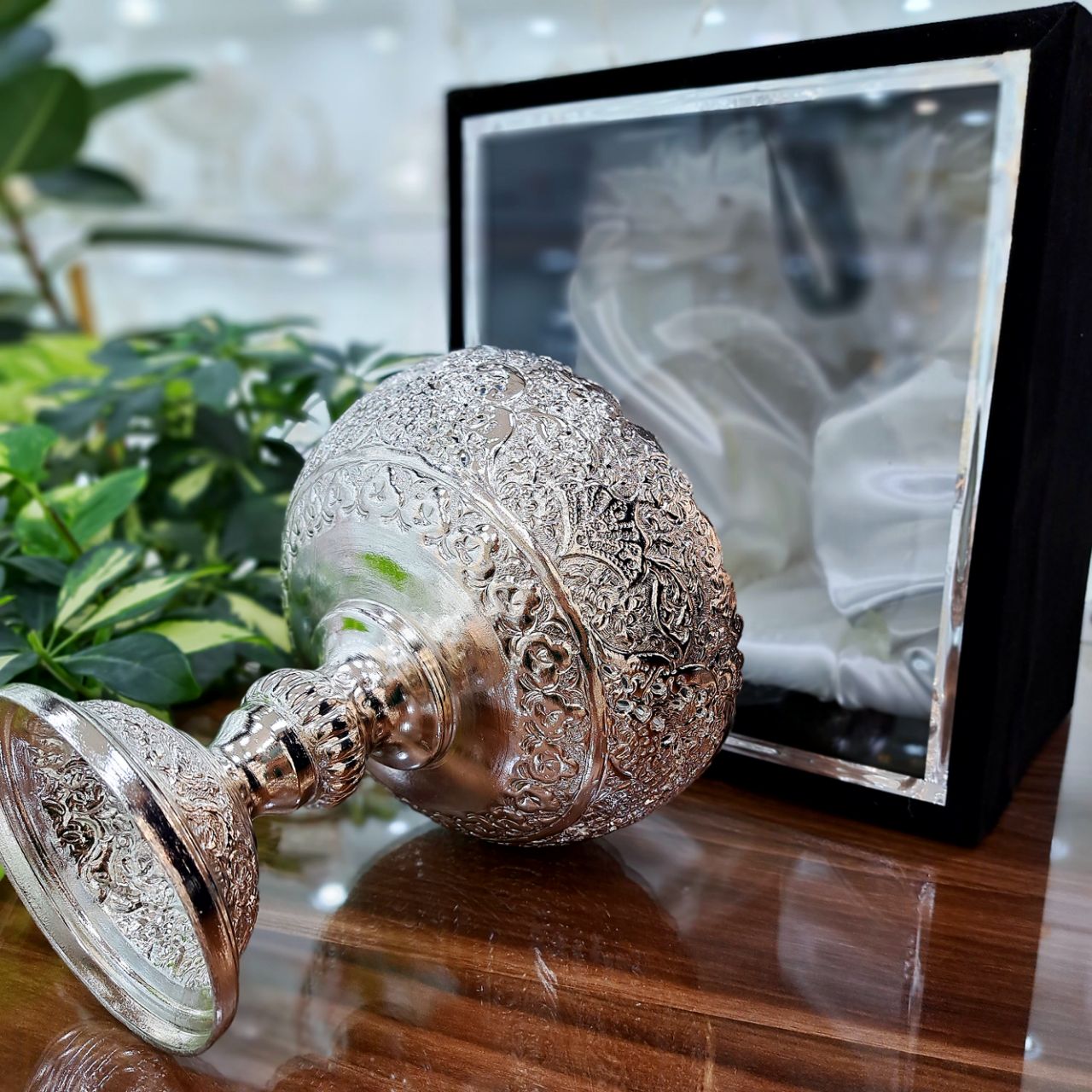 کاسه آجیل قلمزنی نقره نما با روکش نقره به همراه باکس جیر