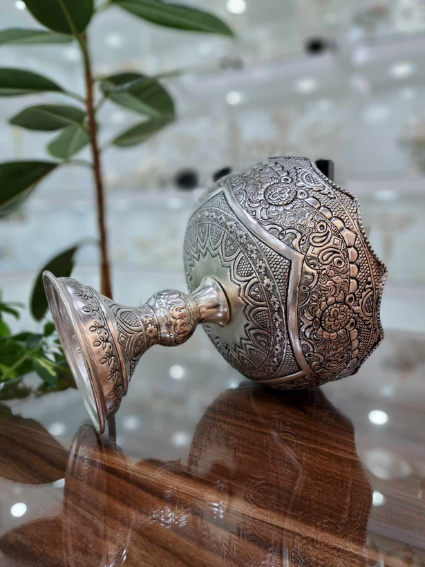 میوهخوری قلمزنی نقرهنما قلم اسلیمی جلوهای از شکوه و اصالت هنر ایرانی است که با تلفیق طراحی سنتی و ساخت ظریف، زینتبخش هر دکوراسیونی خواهد بود. این اثر فاخر با ارتفاع ۲۵ سانتیمتر و دهانه ۲۵ سانتیمتر، بهصورت دستساز توسط هنرمندان خوشذوق اصفهانی قلمزنی شده و با روکش نقره درخشان پوشانده شده است تا زیبایی و دوام بیشتری داشته باشد.