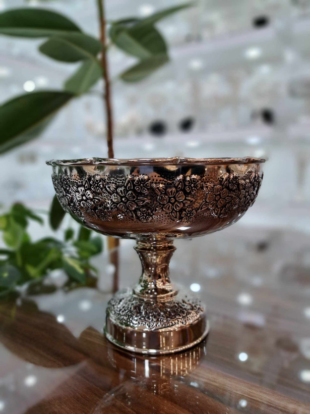 درخشش نقرهای روکش کروم در کنار تراشهای سنتی گلبرگ و نقش گل ریز، جلوهای مدرن و اصیل ایجاد میکند که مناسب هر سبک دکوراسیون — از کلاسیک تا مدرن — است. این سرویس نه تنها برای پذیرایی از مهمانان، بلکه به عنوان دکور لوکس و هنری نیز انتخابی عالی محسوب میشود.