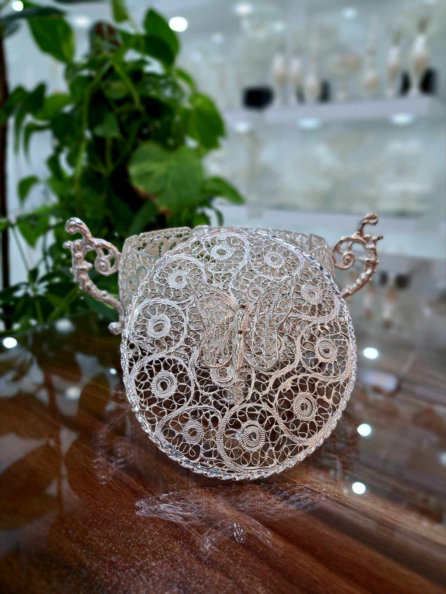 ترکیب زیبای سیمهای ظریف ملیله، پیچوخمهای هنرمندانه و سطح نقره باعث شده این شکلاتخوری، علاوه بر کاربری روزمره، به یک قطعه دکوری لوکس تبدیل شود؛ مناسب برای پذیرایی رسمی، ویترین، جهیزیه و هدیهای ماندگار.