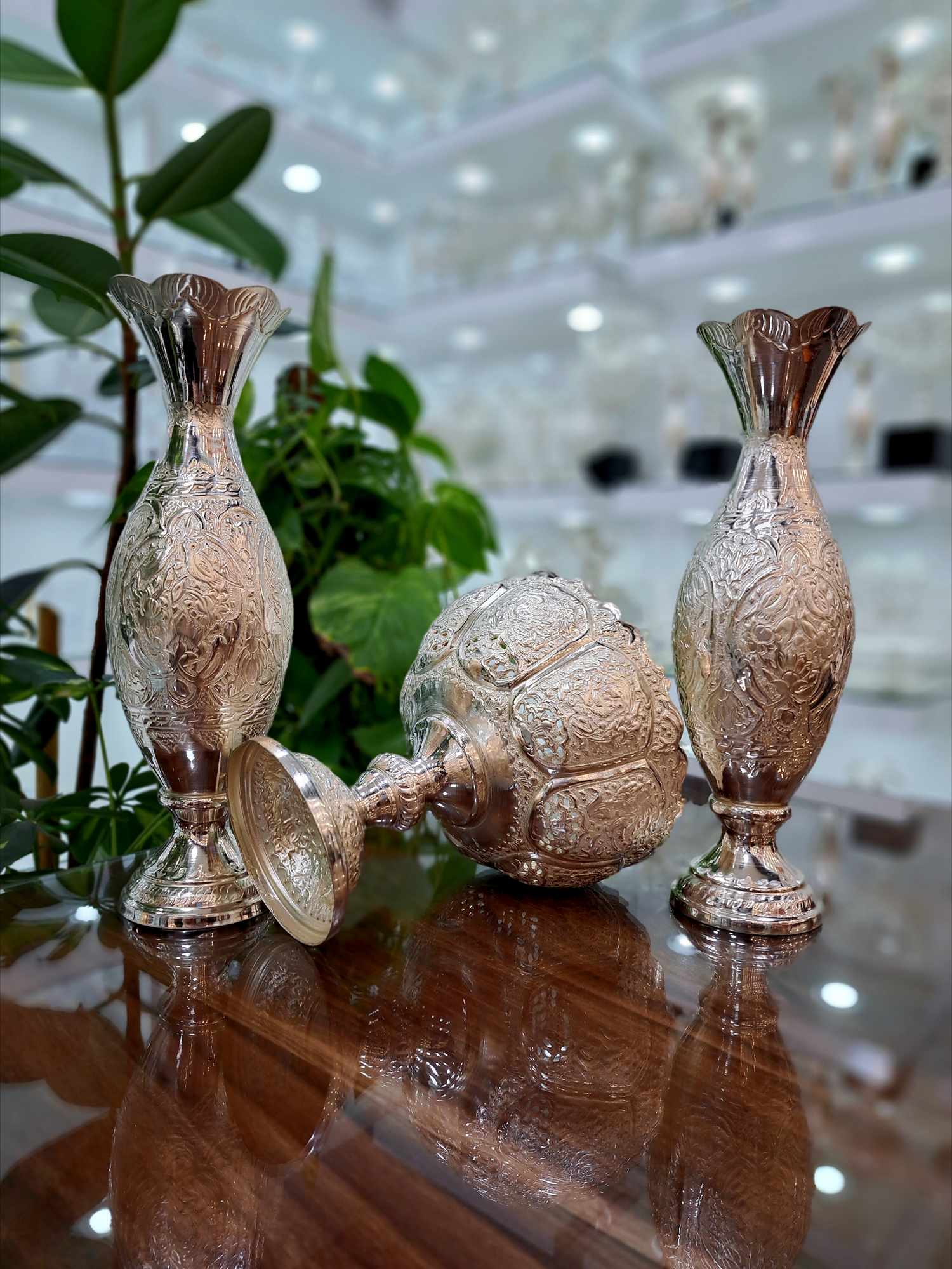 ست سه تیکه گلدان و کاسه آجیل قلمزنی نقره نما با روکش نقره و قلم گل و مرغ