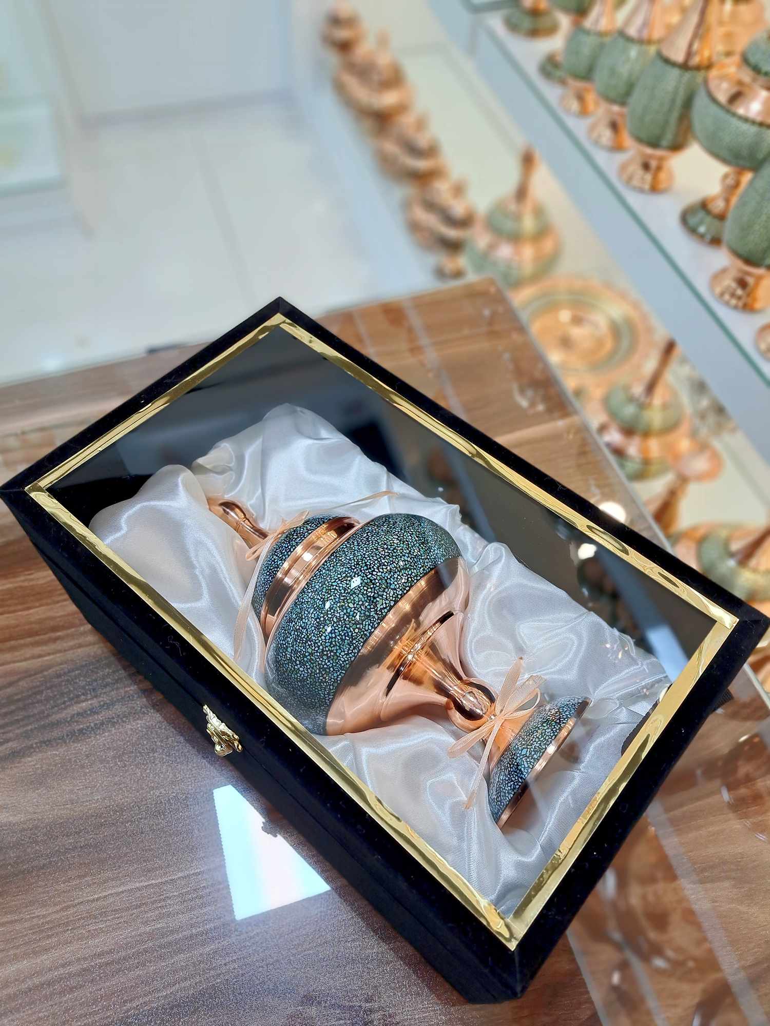 بدنه مسی این شکلاتخوری با دقت بالا پرداخت شده و سطح آن با قطعات فیروزه نیشابور تزئین شده است؛ ترکیبی که علاوه بر زیبایی، حس گرما، آرامش و ارزش هنری را به فضای خانه هدیه میدهد. درخشش مس و بافت طبیعی فیروزهها جلوهای منحصربهفرد ایجاد میکند که در هر نگاه، کیفیت و اصالت ساخت آن را به رخ میکشد.