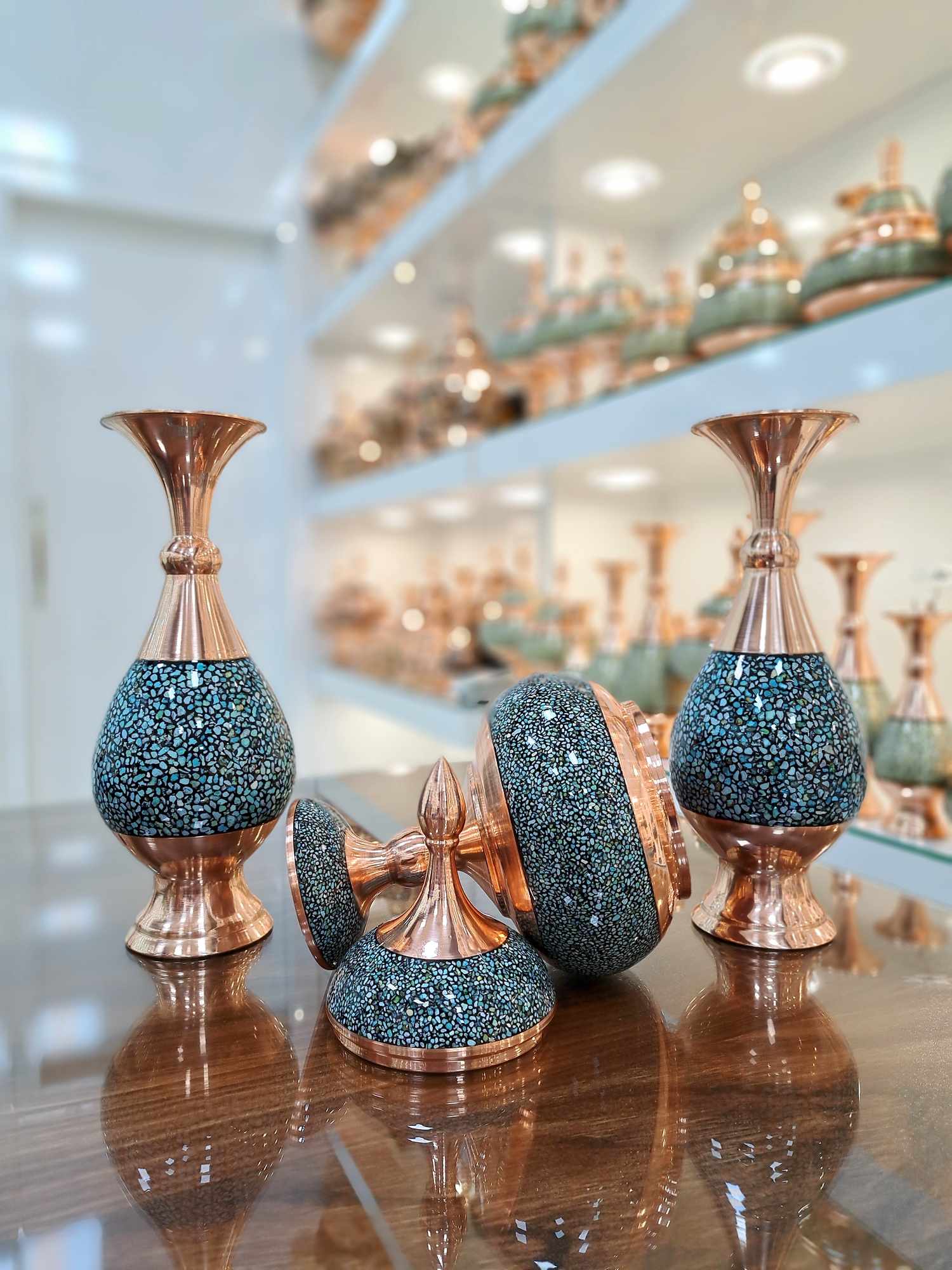 بدنه مسی هر سه قطعه با دقت بالا پرداخت شده و سطح آنها بهصورت دستی با فیروزه طبیعی نیشابور تزئین شده است. ترکیب درخشش مس و بافت طبیعی سنگهای فیروزه، حس آرامش، شکوه و ارزش هنری را به فضای منزل یا محل کار میبخشد و اصالت هنر فیروزهکوبی ایرانی را به زیبایی به نمایش میگذارد.