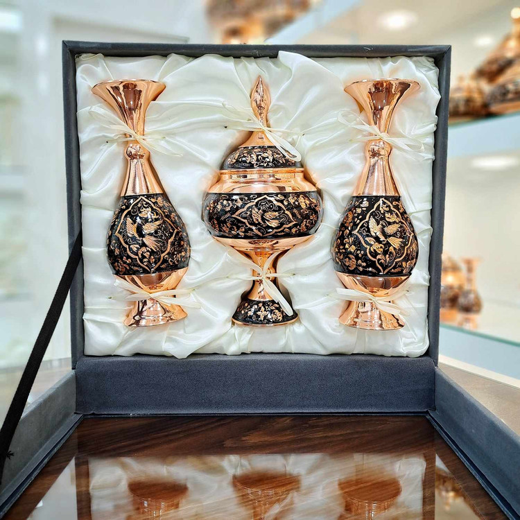 ست گلدان 25 و شکلات خوری 28 مسی الماس تراش سایز بزرگ به همراه جعبه جیر